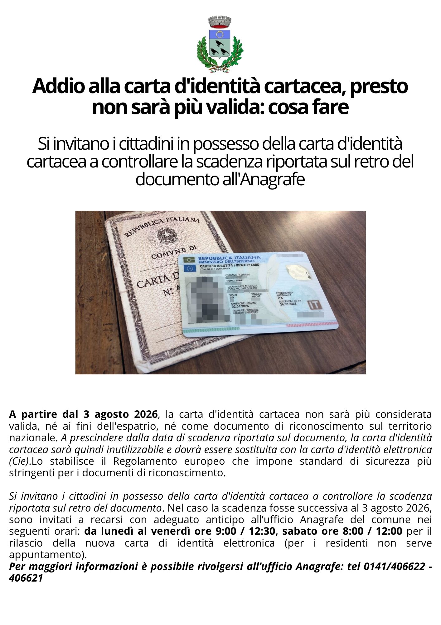 Nel caso la scadenza fosse successiva al 3 agosto 2026, sono invitati a recarsi con adeguato anticipo all'Ufficio Anagrafe del Comune nei seguenti orari: da lunedì al venerdì ore 9:00 / 12:30, sabato ore 8:00 /12:00 per il rilascio della nuova carta di identità elettronica (per i residenti non serve appuntamento). Per maggiori informazioni è possibile rivolgersi all'ufficio Anagrafe: T. 0141406621 - 0141406622
