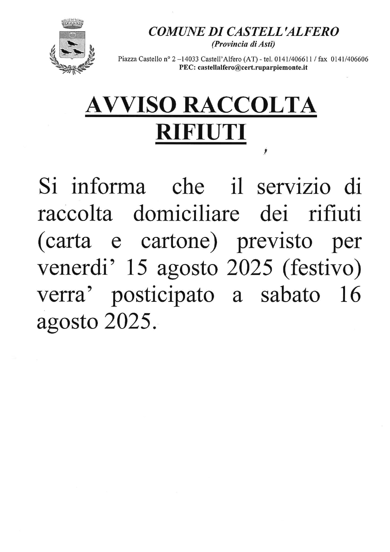 Avviso raccolta rifiuti posticipato per Ferragosto