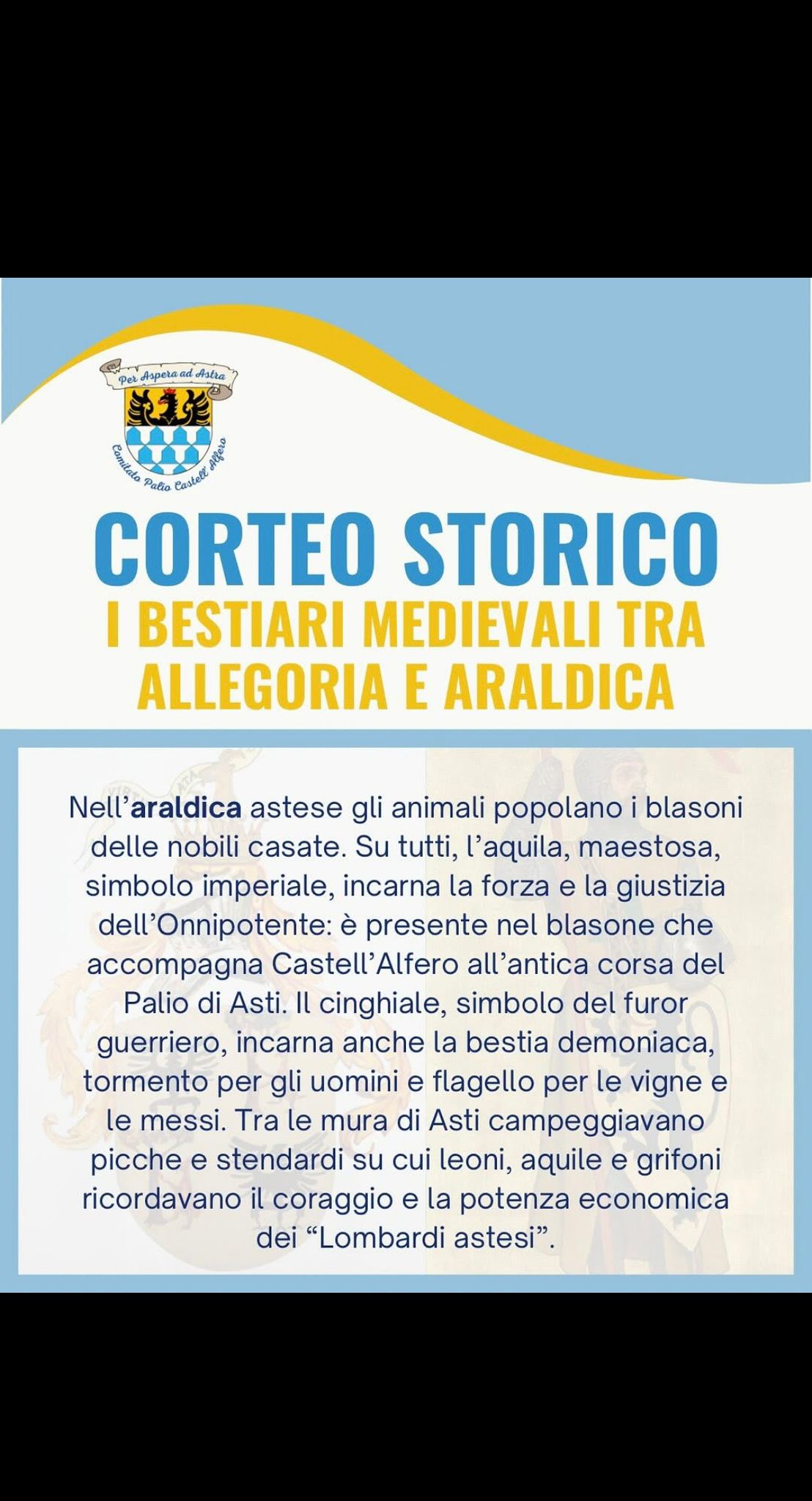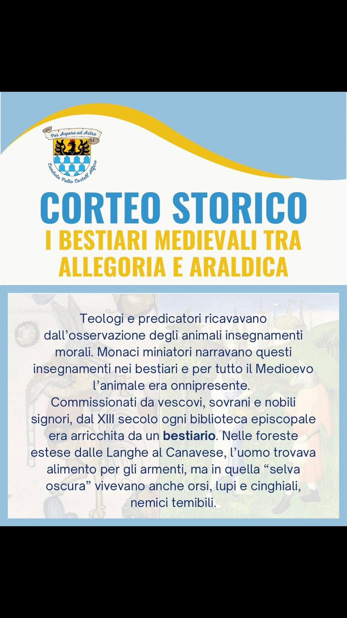 Domenica 7 settembre 2025, nel grande Corteo Storico del Palio di Asti, il Comune di Castell’Alfero sfilerà con un tema affascinante e ricco di simboli: “I bestiari medievali tra allegoria e araldica”.