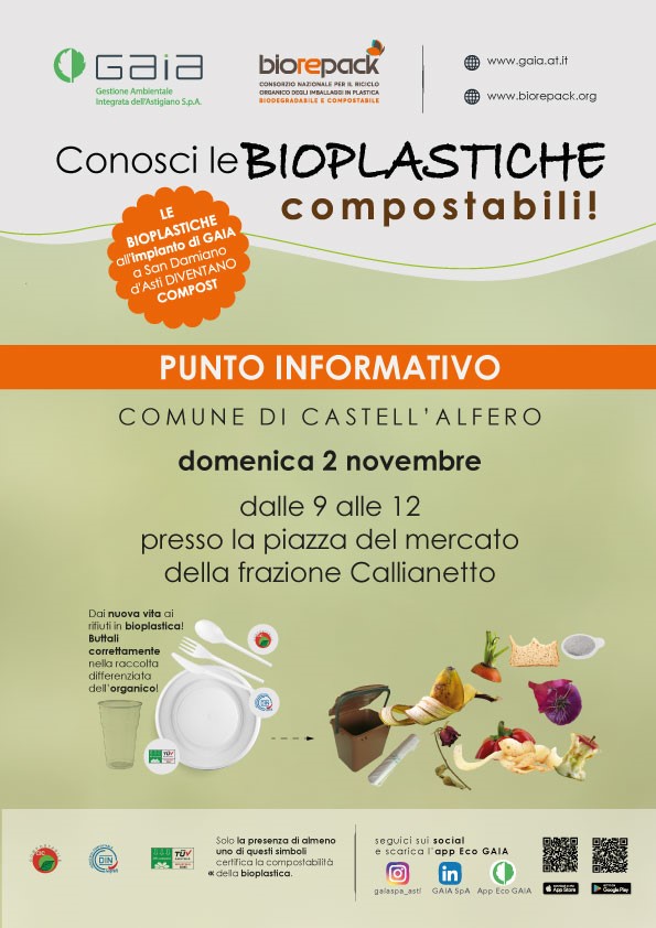 Punto informativo sulla conoscenza delle bioplastiche, domenica 2 novembre dalle 9:00 alle 12:00, nella Piazza del mercato a Callianetto