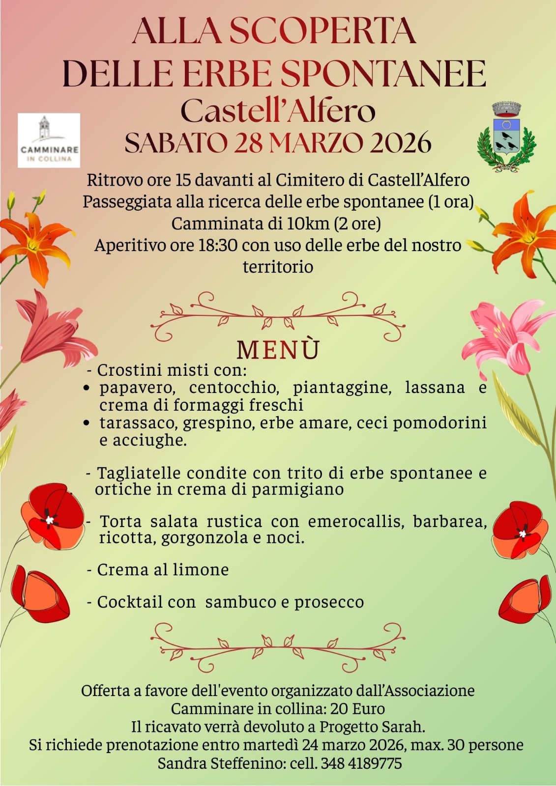 Offerta a favore dell'evento organizzato dall'Associazione Camminare in collina: 20 Euro Il ricavato verrà devoluto a Progetto Sara. Si richiede prenotazione entro martedì 24 marzo 2026, max. 30 persone. Sandra Steffenino: cell. 348 4189775