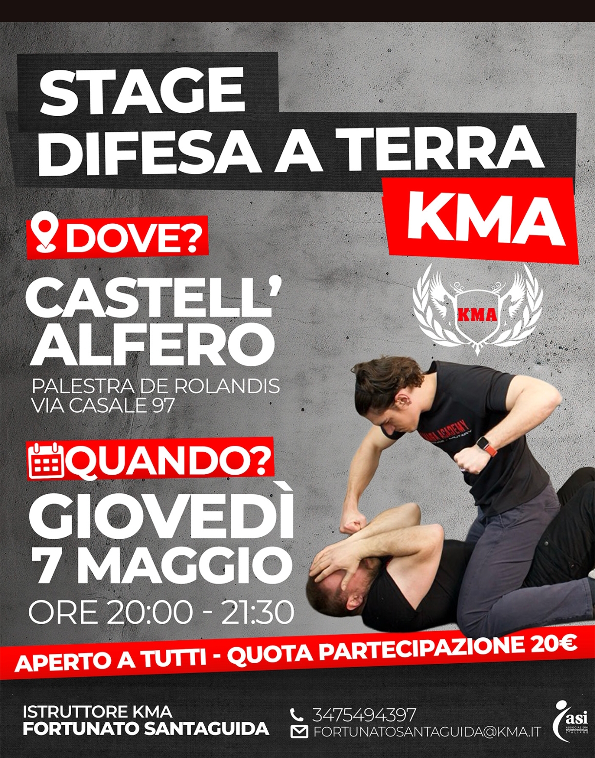 STAGE DIFESA A TERRA (KMA)                                                                                                                                                                   CASTELL'ALFERO ---> PALESTRA DE ROLANDIS, VIA CASALE 97                                                                                                    GIOVEDÌ 7 MAGGIO DALLE ORE 20:00 ALLE ORE 21:30
